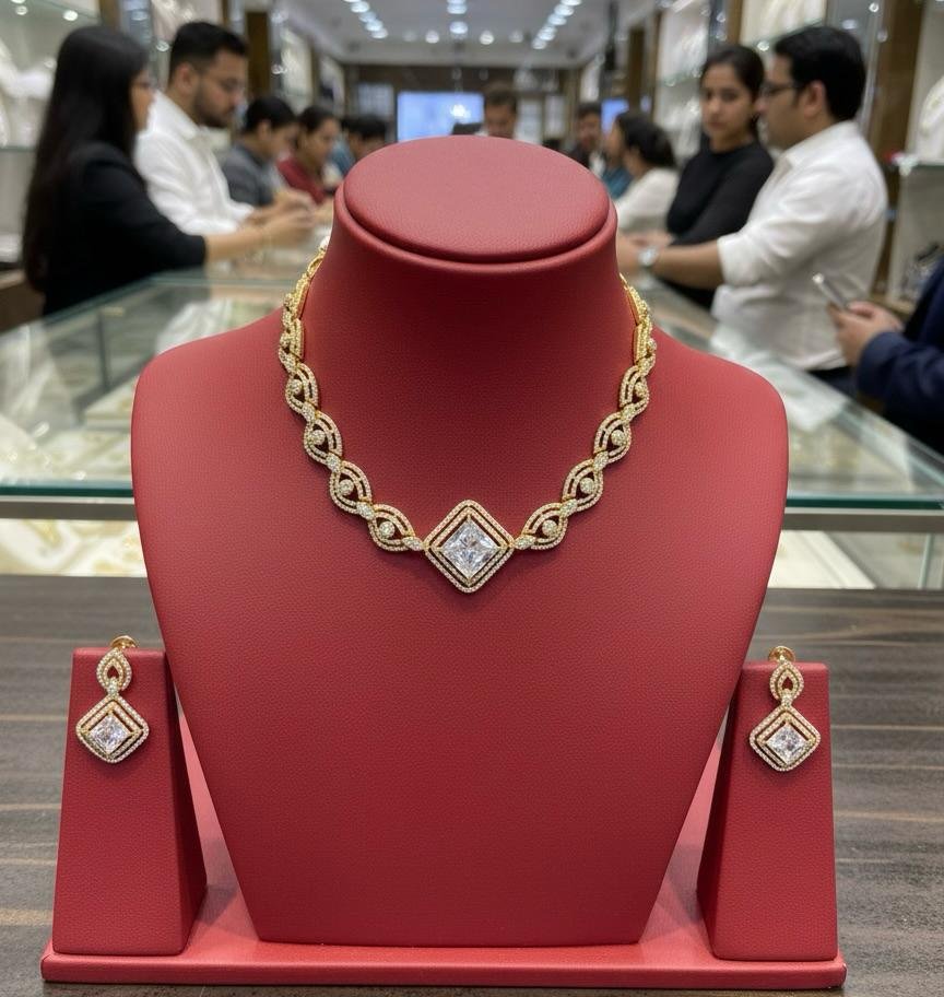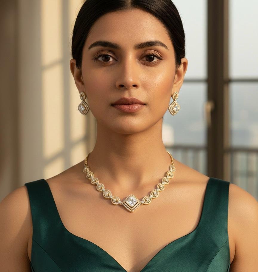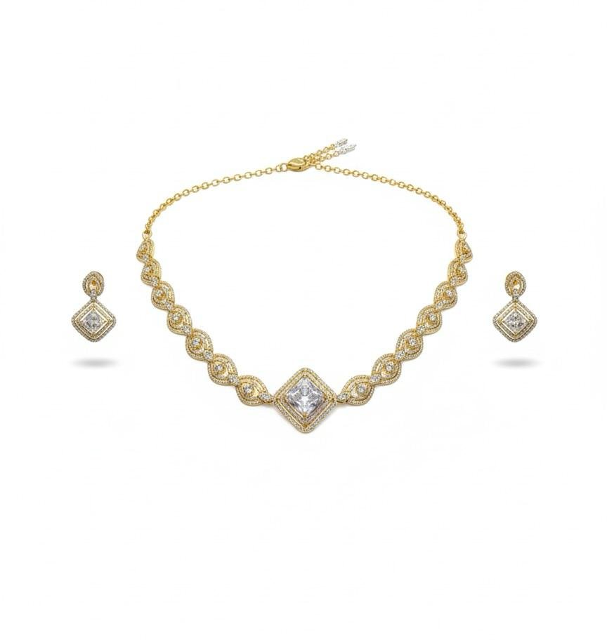 American Diamond Antique Gold Polish AD Necklace Jewellery Set