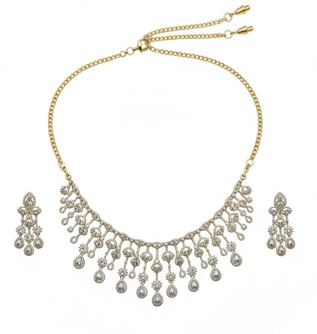 Make a royal style statement with this exquisite American Diamond AD Necklace Jewellery Set, crafted with a luxurious antique gold polish for a timeless and premium finish. Adorned with high-quality American diamond stones, this set delivers exceptional sparkle and refined elegance.