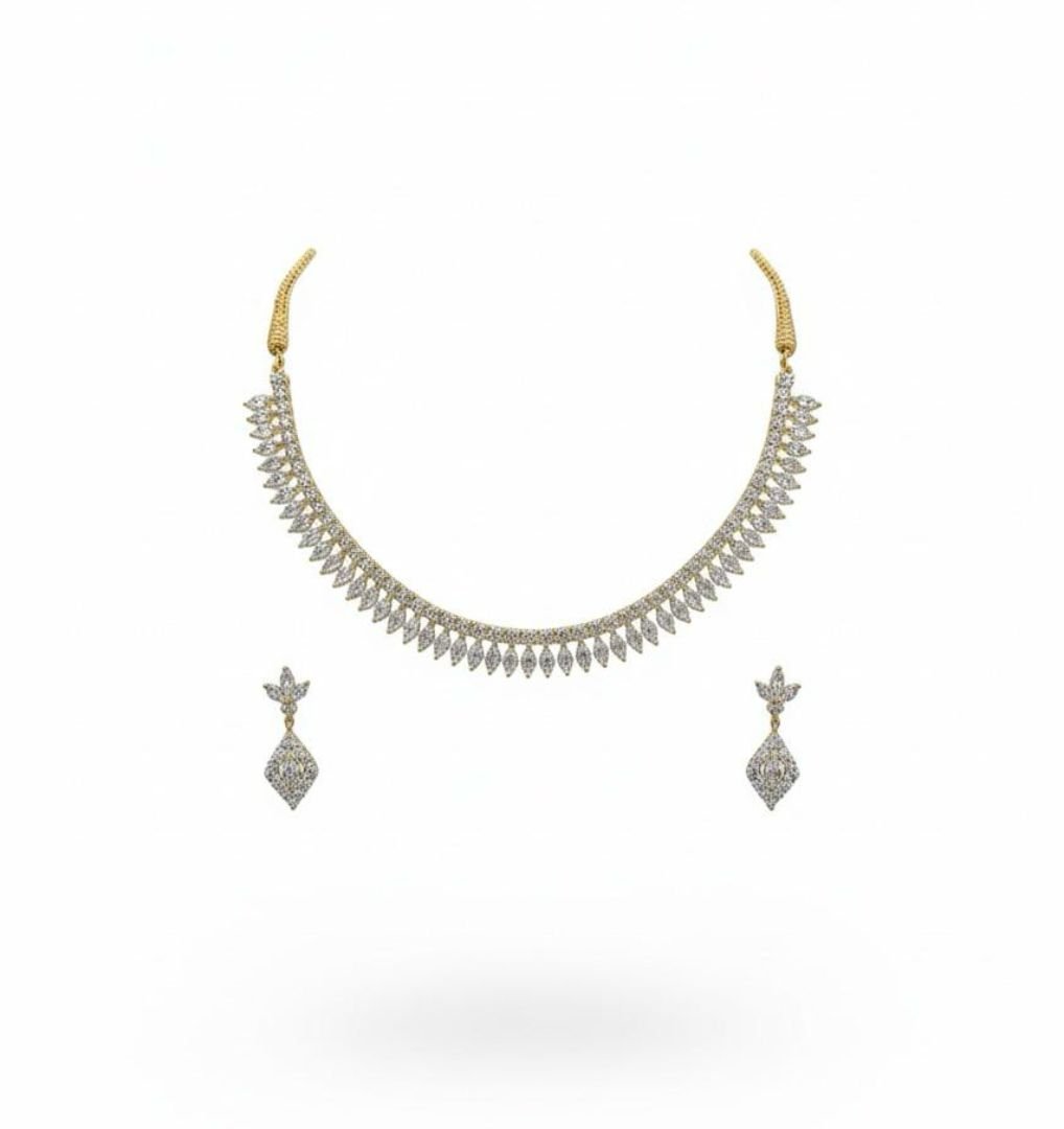 Enhance your ethnic look with this beautifully crafted American Diamond AD Necklace Jewellery Set, finished with a rich antique gold polish that gives a premium traditional appeal. Studded with sparkling American diamonds, this set reflects elegance and sophistication, making it an ideal choice for special occasions.