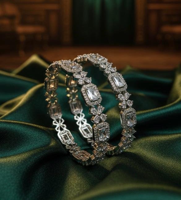 American Diamond gold plated bangles pair with designer sparkle. Perfect for festive & party wear. Sizes 2.4–3.0. MRP ₹599.