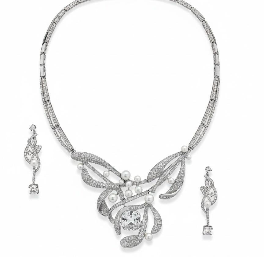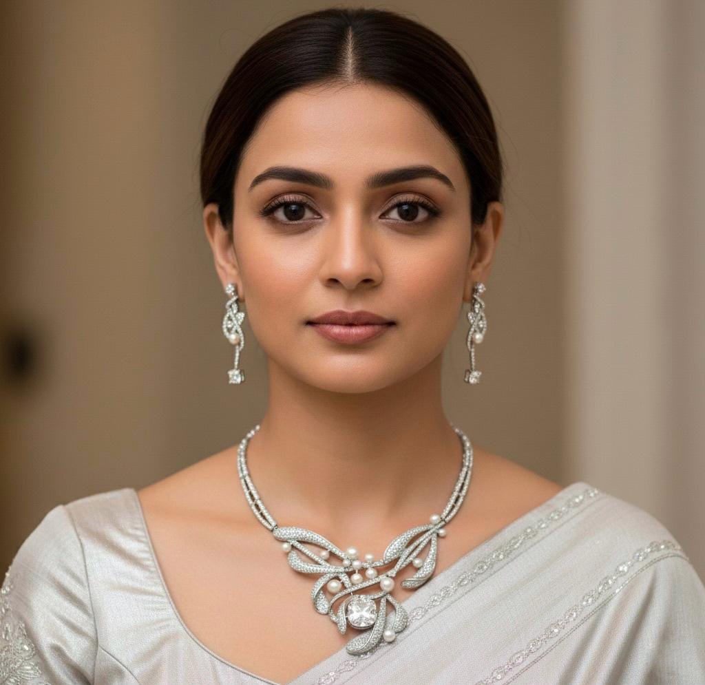 American Diamond & Pearl Work Silver Plated Necklace Jewellery Set ✨️