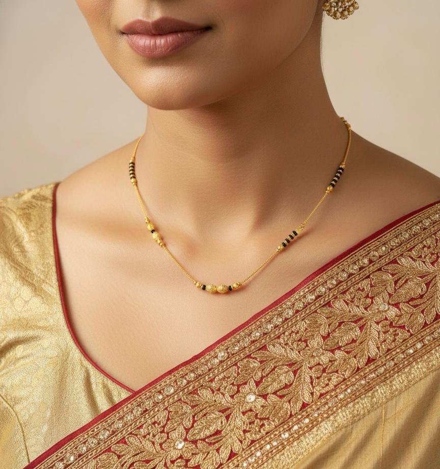 This American Diamond Stone Work Mangal Sutra is designed to give a simple yet graceful traditional look. The fine American diamond stone work adds a subtle shine, while the black pearl work gives it a classic mangal sutra appearance. The beautiful gold polish ✨ enhances the overall finish of the design.
