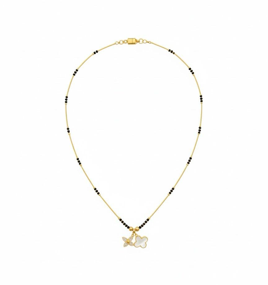 This American Diamond Stone Work Mangal Sutra is designed to offer a simple yet graceful traditional look. The fine American diamond stone work adds a subtle shine, while the black pearl work gives it a classic mangal sutra appearance. The elegant gold polish ✨ enhances the overall beauty of the design.