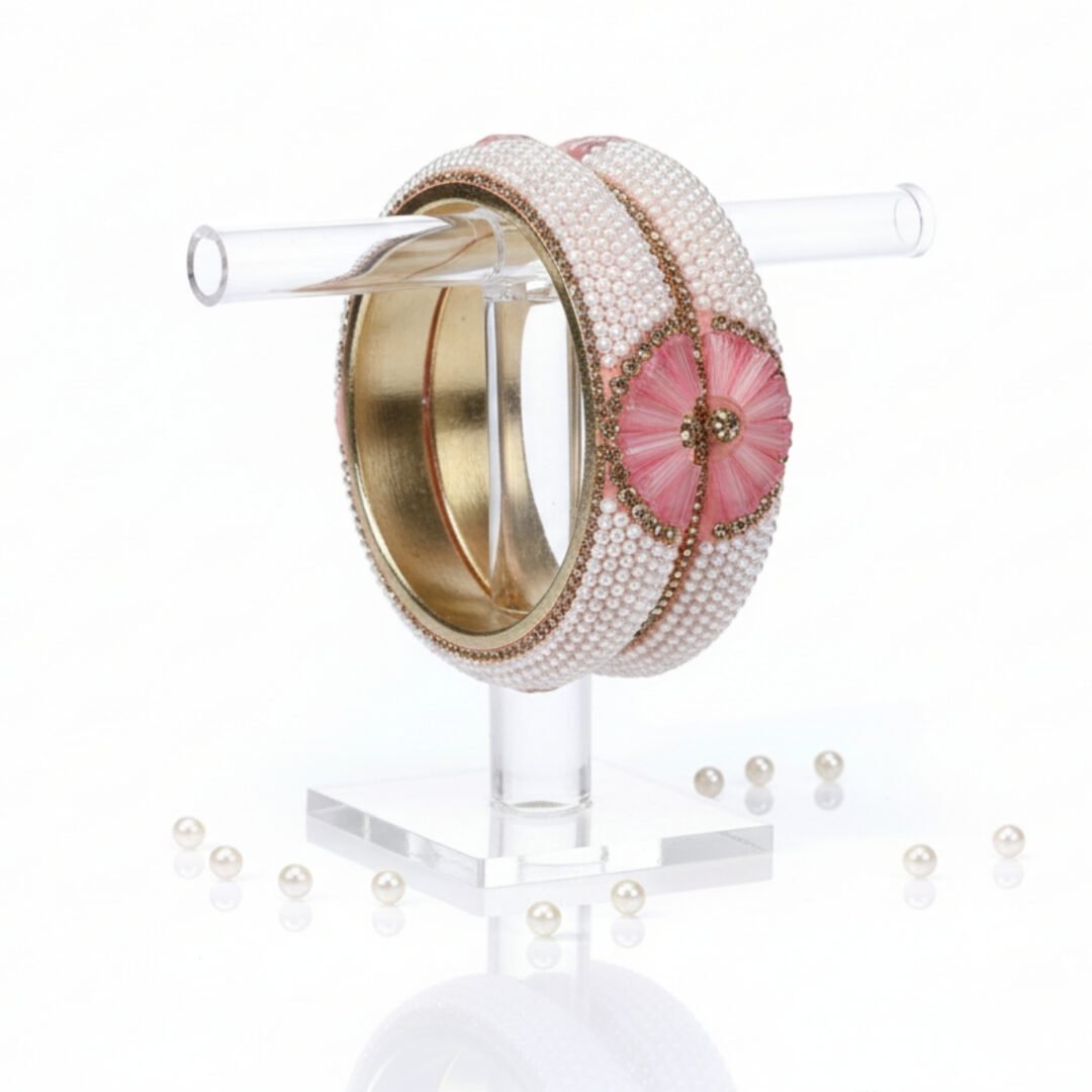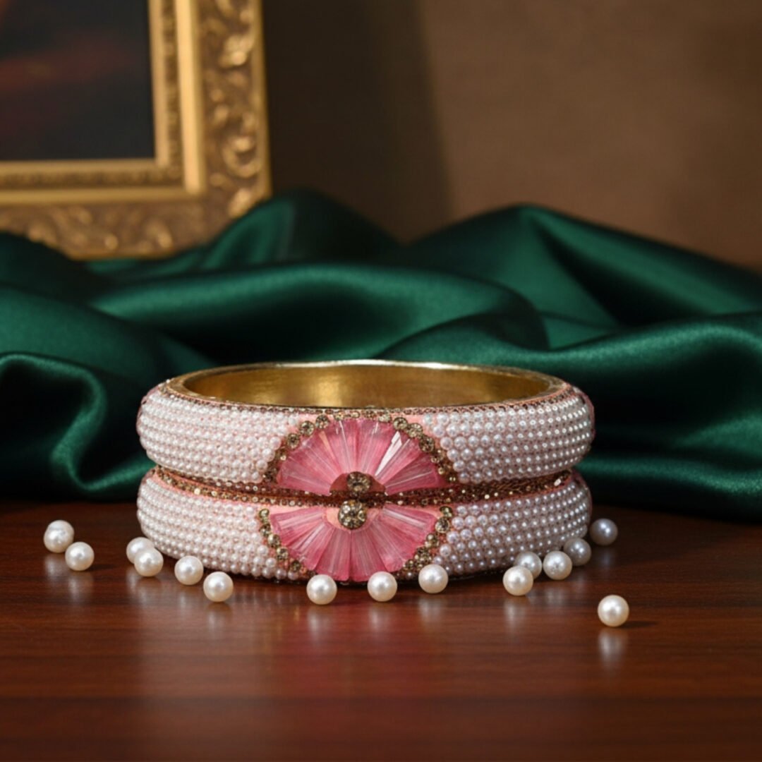 Add a charming touch to your ethnic ensemble with these beautifully crafted brass metal bangles in a graceful Gazri Pink colour. The soft yet vibrant shade brings a fresh and elegant look, making these bangles ideal for festive occasions, traditional functions, weddings, and everyday ethnic wear. Each bangle is adorned with sparkling stone embellishments and delicate pearl work, creating a perfect balance of shine and sophistication.