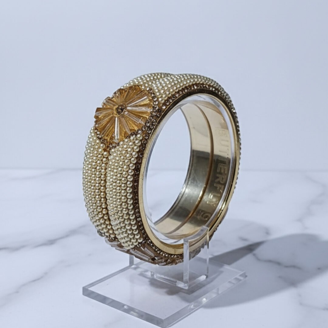 Add a touch of regal elegance to your jewellery collection with these finely crafted brass metal bangles in a rich golden‑gold‑brown hue. The warm, earthy gold‑brown color gives these bangles a classic yet luxurious appeal — ideal for both traditional and contemporary ethnic wear. Each bangle is adorned with sparkling stone detailing along with delicate pearl work, creating a sophisticated shimmer and elegant texture that enhance the overall design.