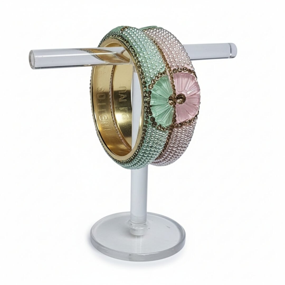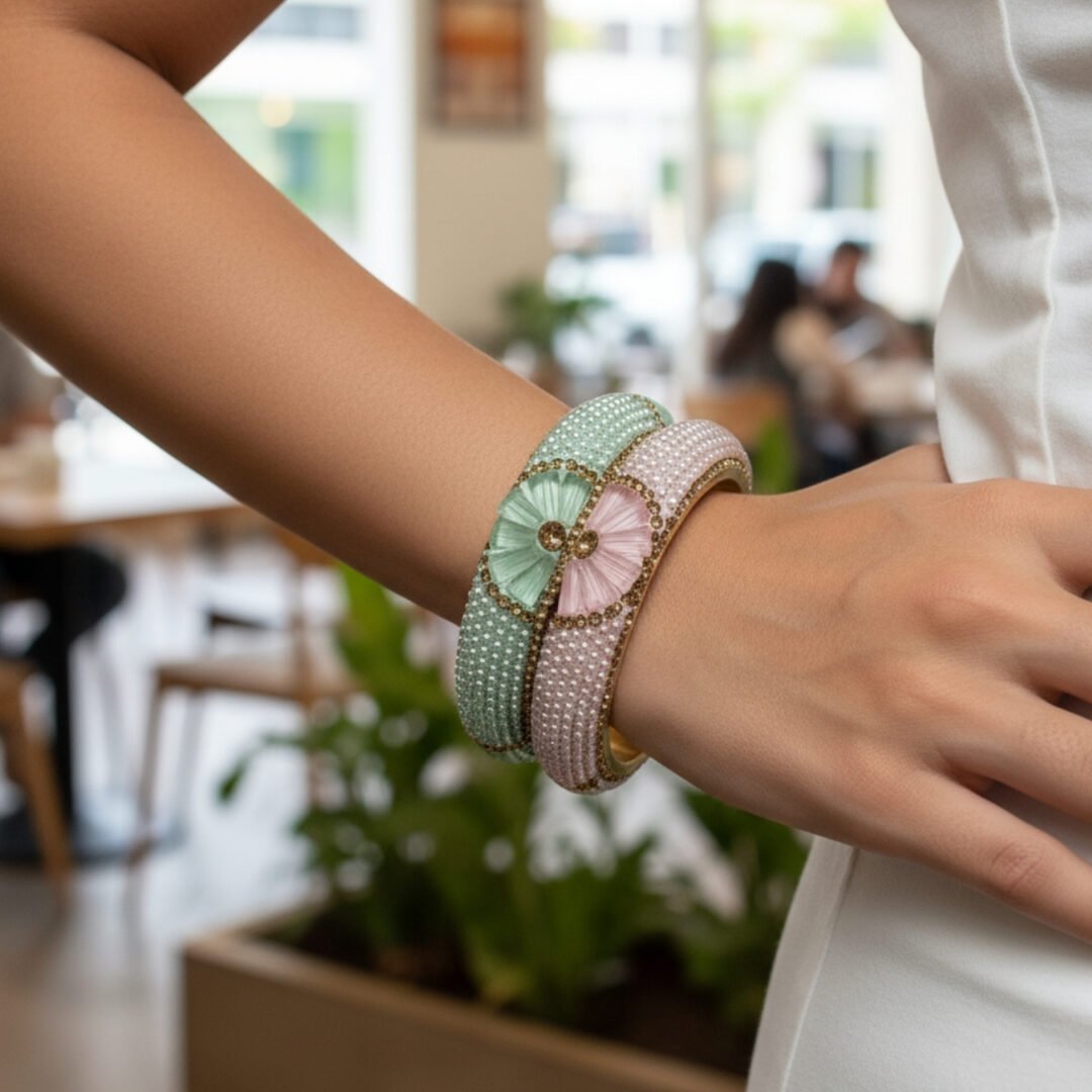 Elevate your traditional jewelry collection with these exquisitely crafted brass metal bangles, designed in a refreshing mint pista and soft pink color combination. The harmonious blend of these two pastel shades gives the bangles a graceful and eye-catching appeal, perfect for pairing with sarees, lehengas, and festive outfits.