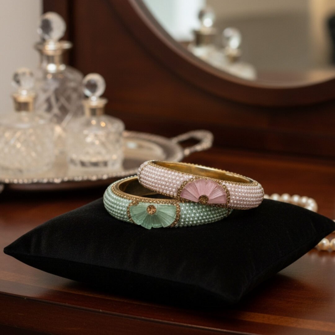 Each bangle is adorned with intricate stone work that adds a subtle sparkle, while delicate pearl detailing enhances its elegance and richness. The smooth finish, fine craftsmanship, and durable brass base ensure long-lasting shine and comfort, making these bangles ideal for special occasions, family functions, weddings, and festive celebrations.