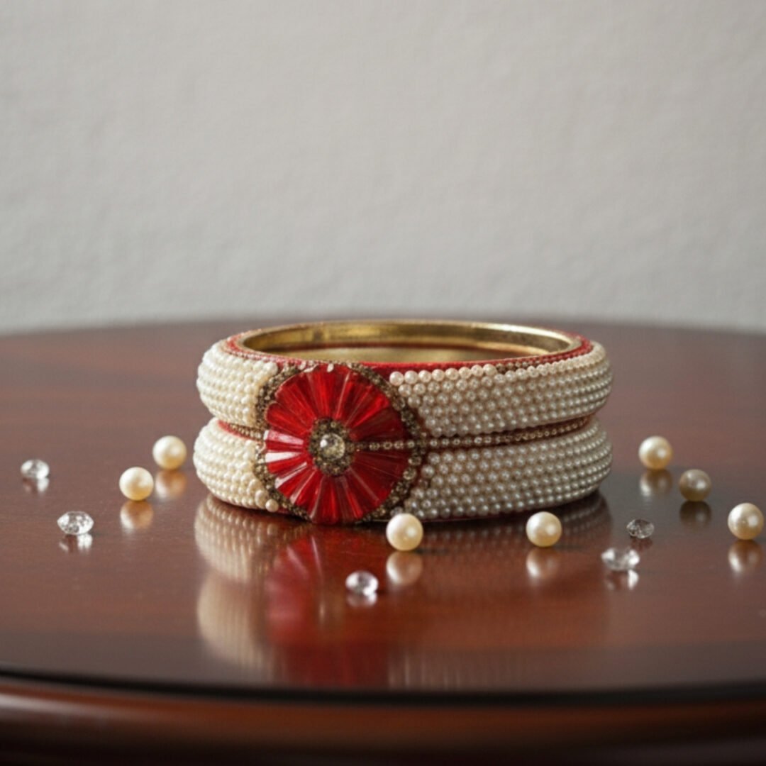 Add a vibrant splash of color to your ethnic collection with these stunning brass metal bangles in a bold red tomato shade. The rich, lively color instantly elevates any traditional outfit, making these bangles perfect for weddings, festive celebrations, or special occasions. Each bangle is beautifully adorned with sparkling stone detailing and delicate pearl work, giving it a graceful shimmer and intricate, eye-catching design.