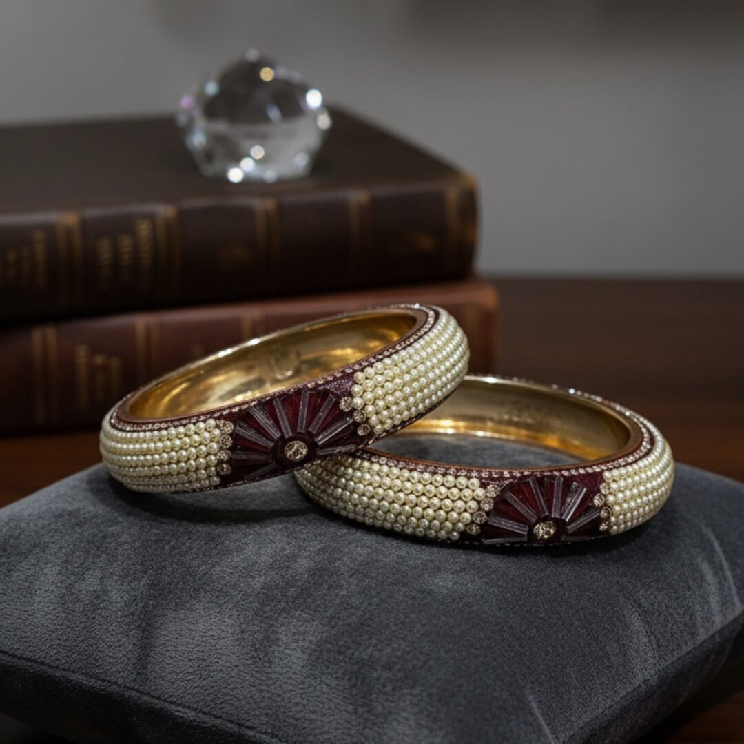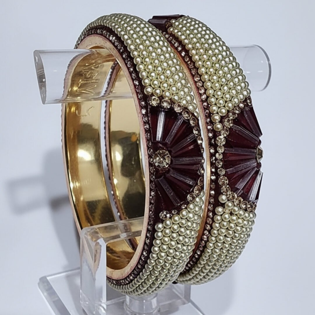Enhance your festive and traditional look with these exquisitely crafted brass metal bangles in a rich wine colour. The deep, luxurious shade adds a touch of elegance and sophistication, making these bangles a perfect accessory for weddings, festive celebrations, and special occasions. Each bangle is beautifully embellished with sparkling stone detailing and delicate pearl work, creating a graceful blend of shimmer and charm.