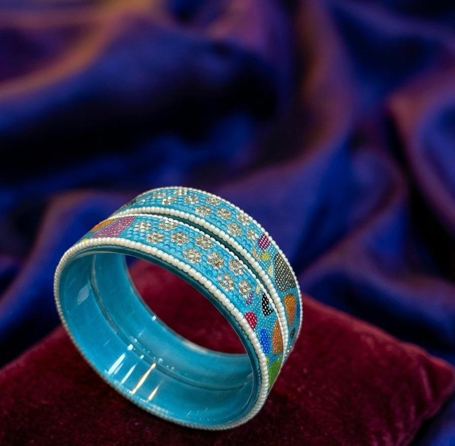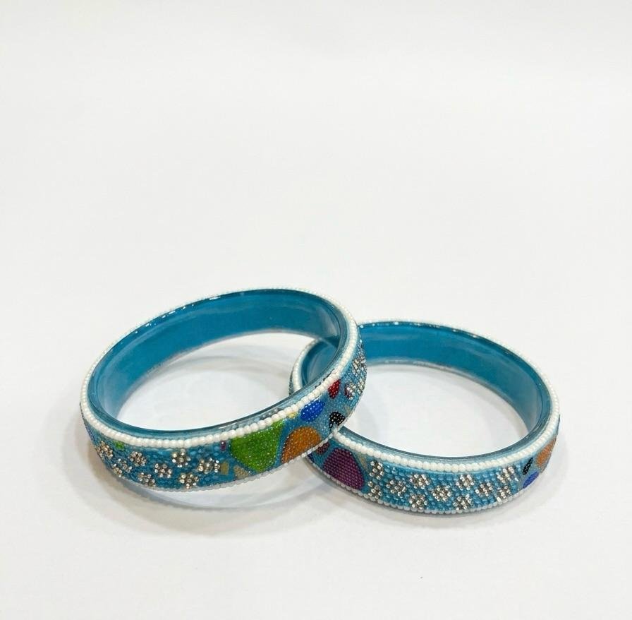 Stylish firozi color glass bangles with intricate multi work design, perfect for weddings, festivals, and ethnic wear. Lightweight and elegant pair available in sizes 24, 26, 28.