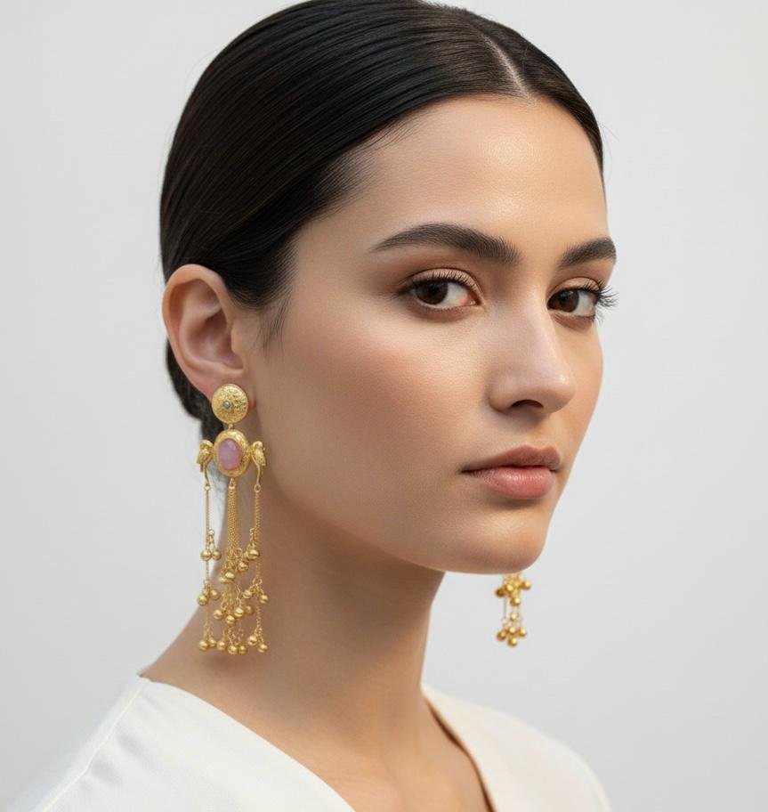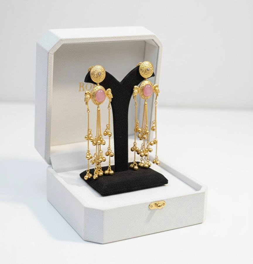 Add a soft, feminine charm to your look with these Kashmira earrings in delicate baby pink colour. Crafted with intricate detailing and a lightweight design, these earrings are perfect for weddings, parties, festive occasions, or gifting. Their subtle yet elegant design makes them ideal for both ethnic and modern outfits.