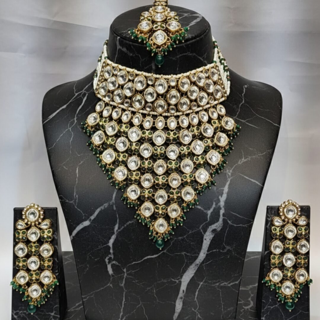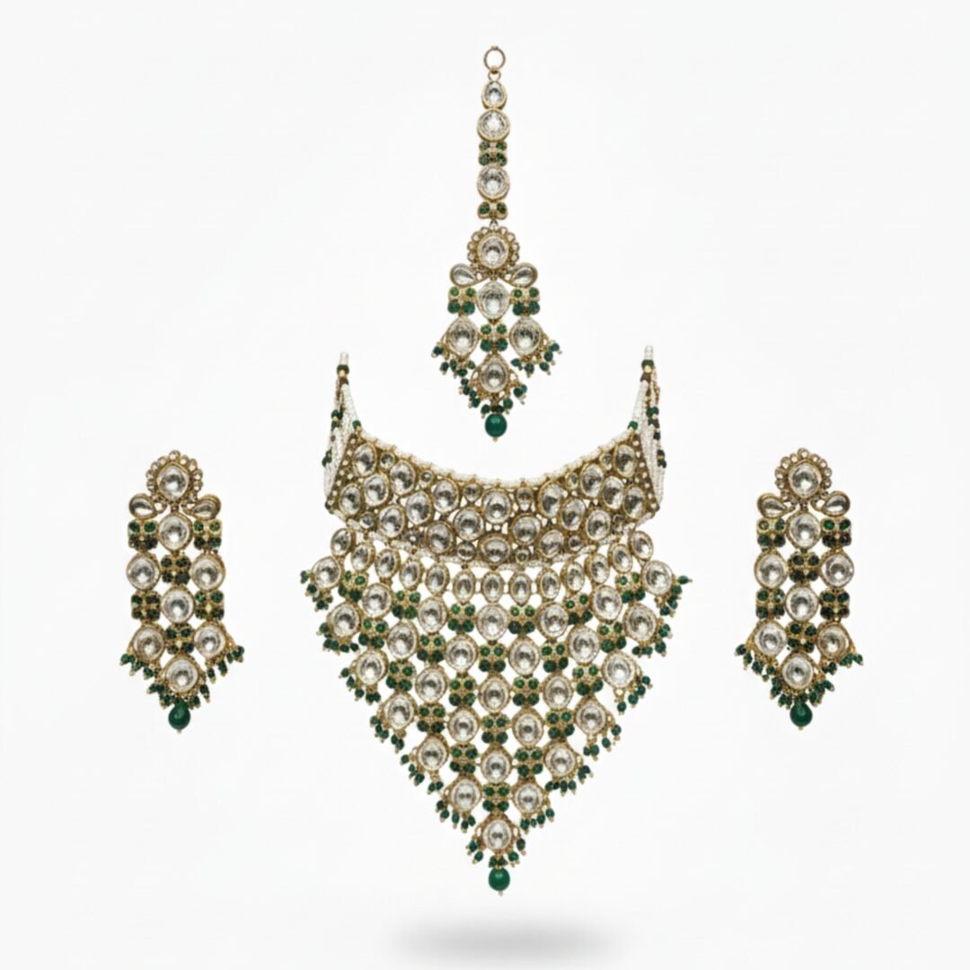 This Kundan set combines traditional craftsmanship with the elegance of green pearls and golden–green tones, creating a statement piece that adds sophistication, charm, and grandeur to any ethnic outfit.
