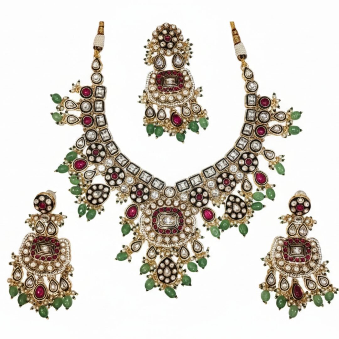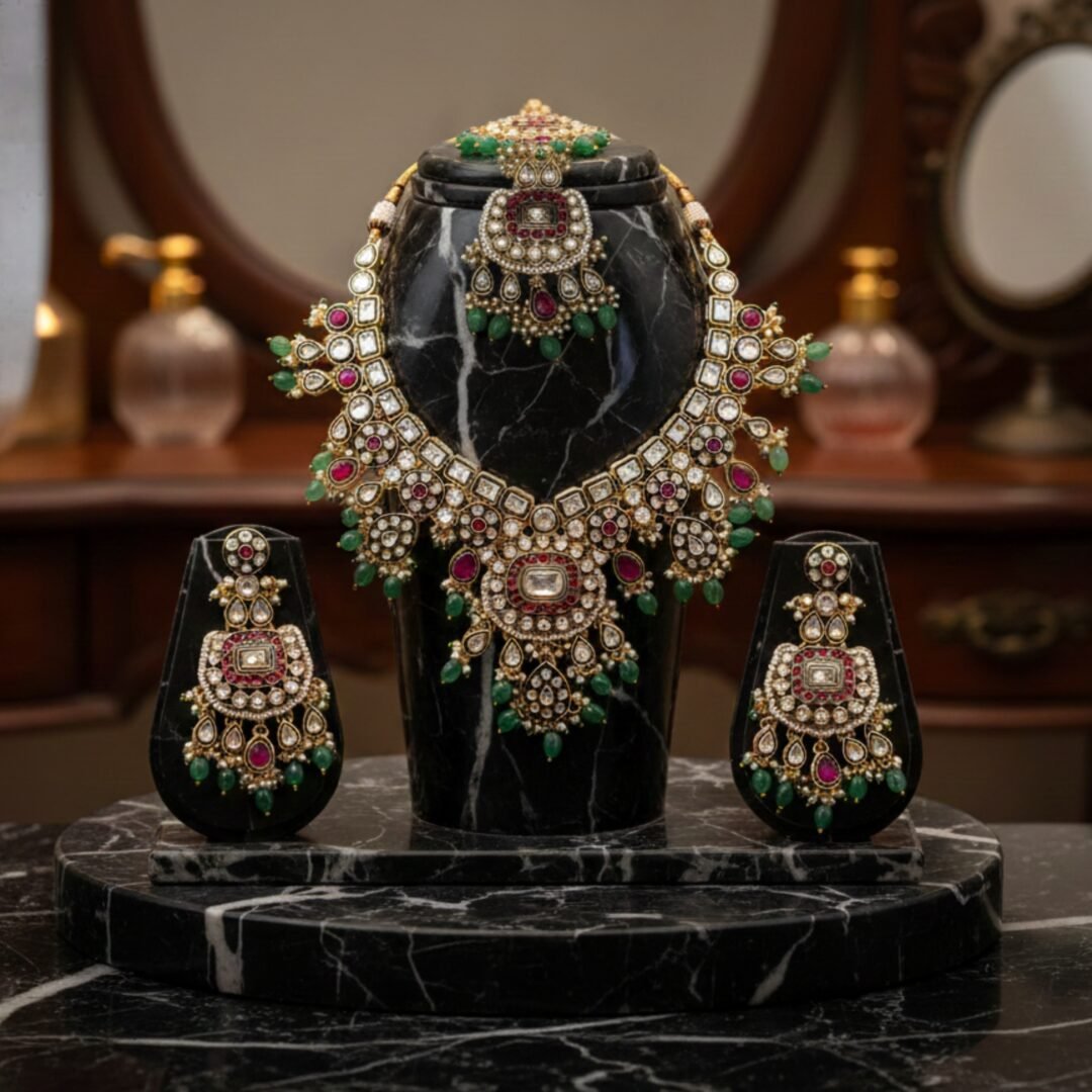 Complete Jewellery Set: Includes Necklace + Matching Earrings (Maangtikka can be added if required).
