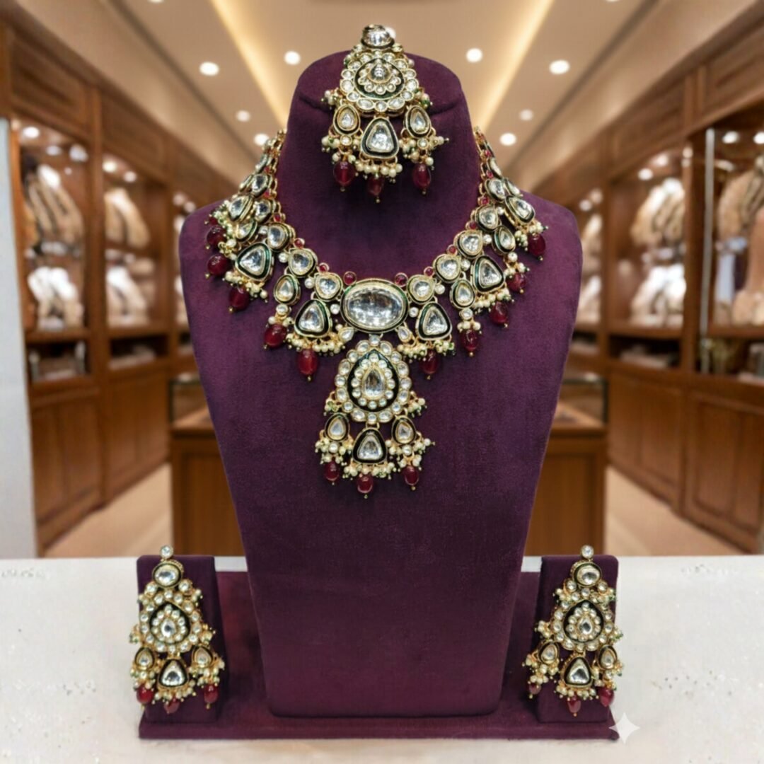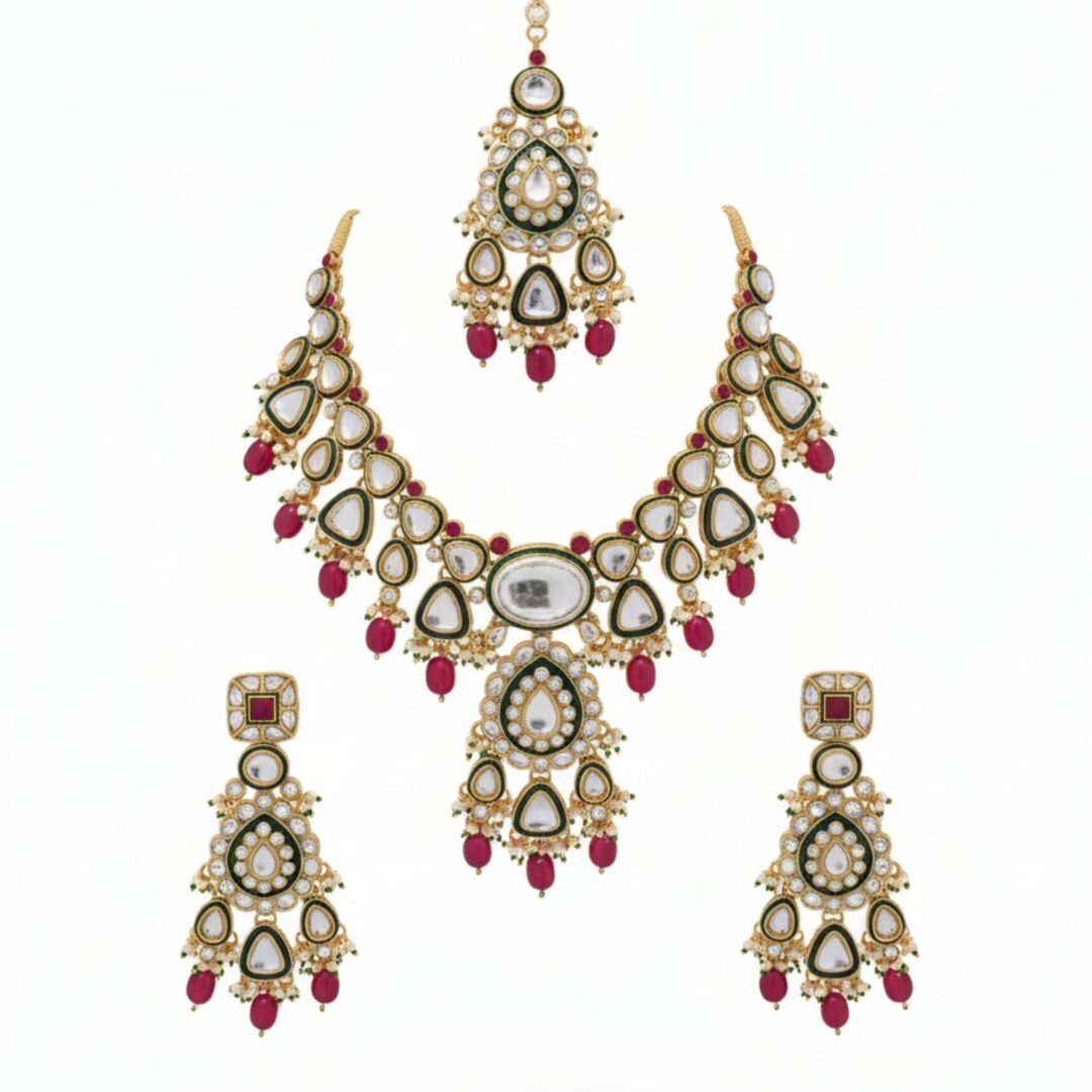 Complete Jewellery Set: Includes Necklace + Matching Earrings + Maangtikka (optional — you can tell me if you want this removed).