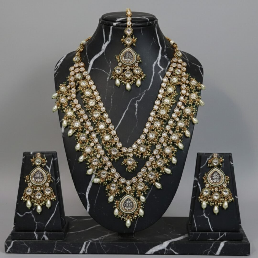 Complete Jewellery Set: Includes Heavy Necklace + Matching Earrings (Maangtikka can be added).