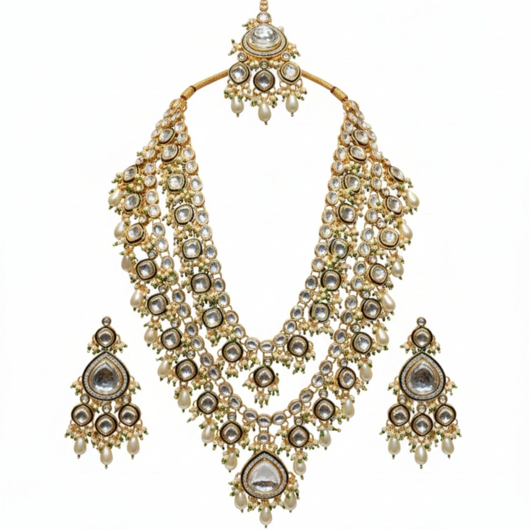 The heavy double-layered design, combined with sparkling Kundan, Mozo Night Stones, and pearl detailing, creates a majestic statement piece that instantly elevates any outfit.