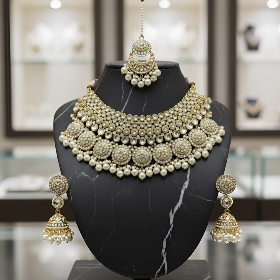 Elevate your festive and bridal look with our Kundan Necklace Set, crafted with intricate detailing and paired with lustrous white pearls. The elegant golden-white finish adds a timeless royal charm, making it perfect for weddings, special occasions, and traditional celebrations.