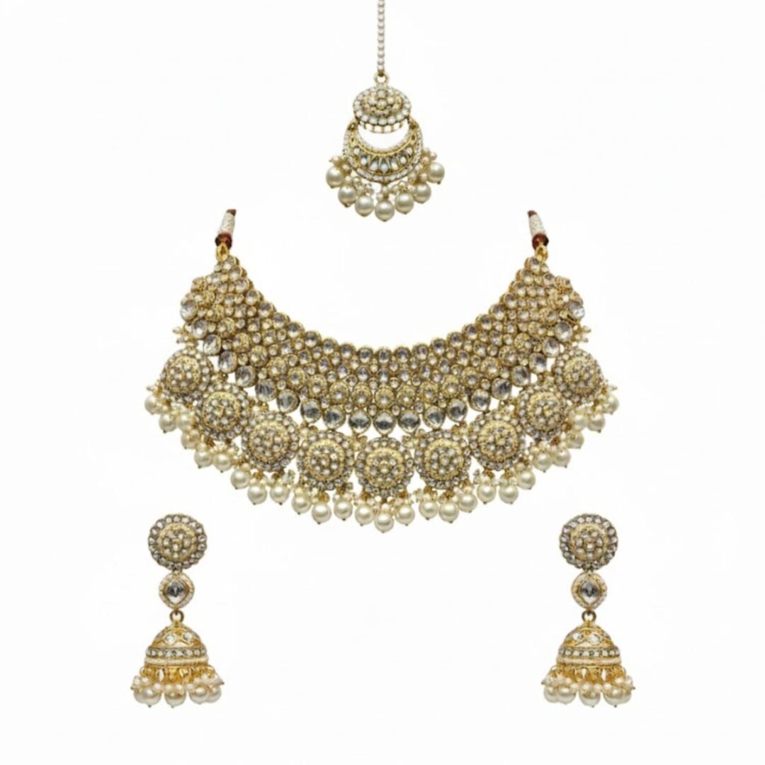 Kundan necklace White pearl Golden White colour Earrings and Tikka
