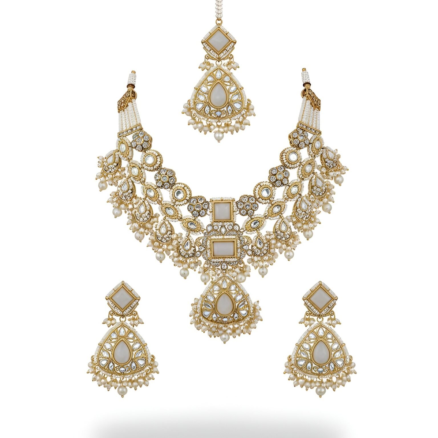 Kundan necklace White pearl Golden White colour Earrings and Tikka