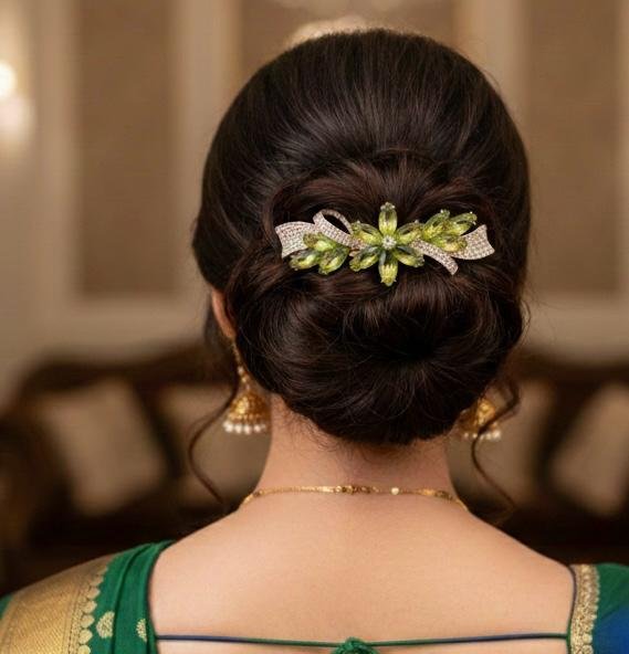 Add a touch of fresh elegance to your hairstyle with the Mint Crystal AD Gold Imported Backclip. Crafted with high-quality imported finish, this beautiful backclip is adorned with sparkling golden American diamond (AD) stones paired with soothing mint crystal work. The smooth gold polish enhances its luxurious yet modern appeal.