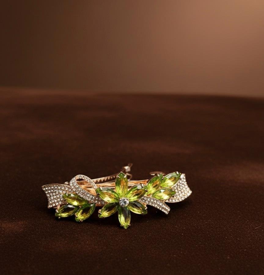 Premium imported backclip hair accessory with rich gold polish, featuring golden American diamond (AD) stones and refreshing mint crystal work.