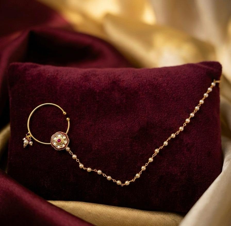Add a touch of royal elegance to your look with this beautiful Bridal Nath with Chain. Designed with sparkling Adi stone work and finished in rich gold polish ✨, this piece reflects timeless traditional charm.
