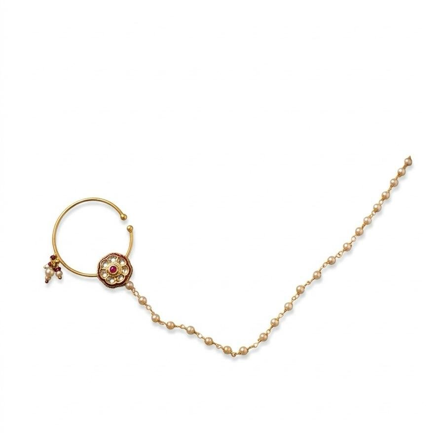 Elegant bridal nath with chain featuring Adi stone detailing and gold polish finish. Perfect for wedding wear.