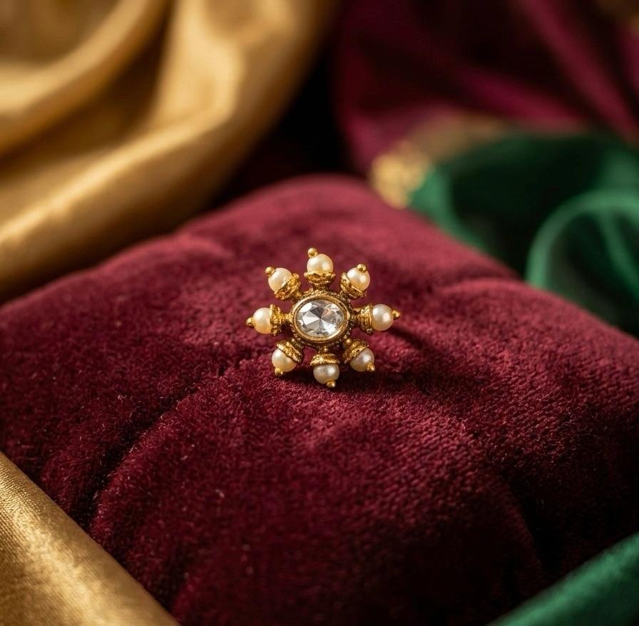 Elegant Kundan and pearl nose ring with rich gold polish finish. Lightweight, classy, and perfect for weddings & festive wear.