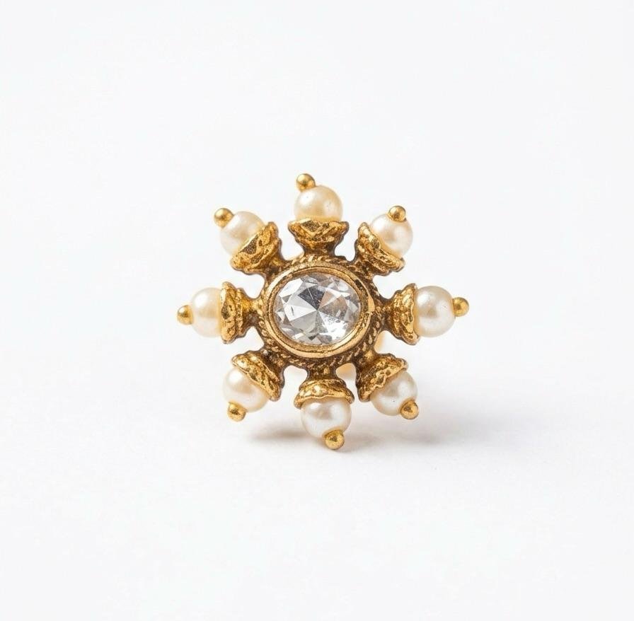 Add a touch of timeless elegance to your look with this beautifully crafted Kundan & Pearl Nose Ring. Designed with intricate detailing, this piece features classic kundan work paired with delicate pearls, all finished in a rich gold polish for a graceful traditional appeal.