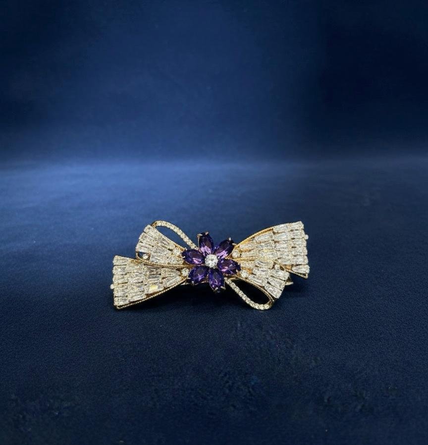 Luxury imported backclip hair accessory with rich gold polish, featuring golden American diamond (AD) stones and elegant purple zamni work.