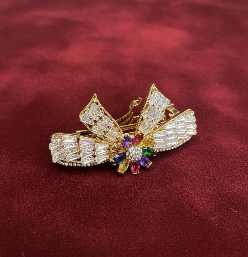 Elegant imported backclip hair accessory with rich gold polish, featuring golden American diamond (AD) stones and vibrant multi-stone work.
