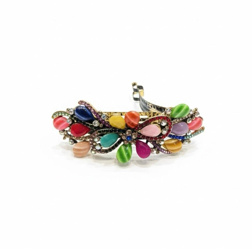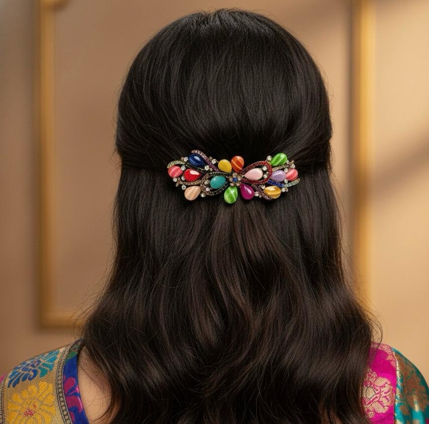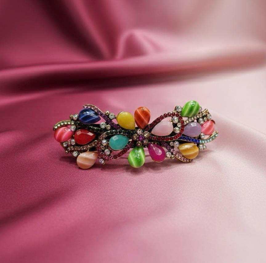 Attractive backclip hair accessory with multi-colour stone work, finished with premium gold LCD polish and secure double-lock style.