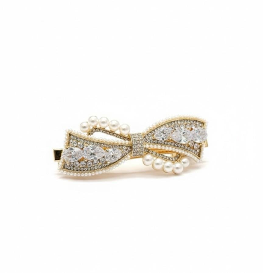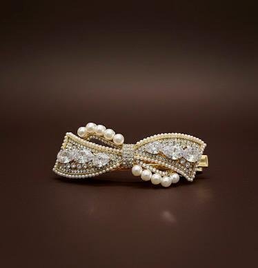 Premium imported backclip hair accessory with rich gold polish, featuring golden stone and pearl work for a luxurious look.