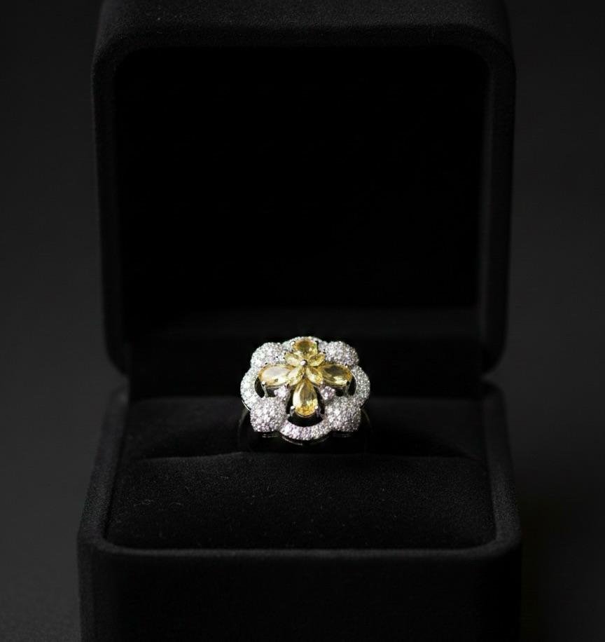 Stylish American diamond finger ring with smooth silver polish, elegant silver and yellow stone work, and adjustable size for a perfect fit.