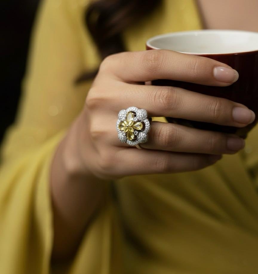 Add a cheerful touch of sparkle to your jewellery collection with the Sunlit Silver Spark American Diamond Finger Ring. Crafted with shimmering American diamond stones and enhanced by a graceful combination of silver and yellow stone work, this ring features a sleek silver polish that gives it a fresh and modern appeal.